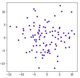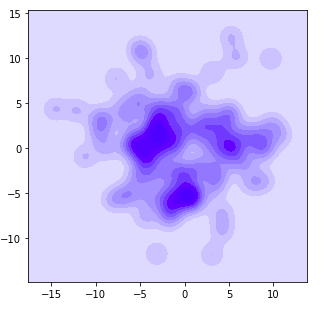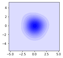 # 2D kde plots import numpy as np import matplotlib.pyplot as plt import seaborn as sns np.random.seed(1) numerical_1 = np.random.randn(100) np.random.seed(2) numerical_2 = np.random.randn(100) fig, ax = plt.subplots(figsize=(3,3)) sns.kdeplot(data=numerical_1, data2= numerical_2, ax=ax, shade=True, color="blue", bw=1) plt.show()