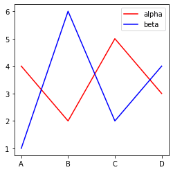 fig, ax = plt.subplots(figsize=(4,4)) sns.lineplot(x=['A','B','C','D'], y=[4,2,5,3], color='r', ax=ax) sns.lineplot(x=['A','B','C','D'], y=[1,6,2,4], color='b', ax=ax) ax.legend(['alpha', 'beta'], facecolor='w') plt.show()