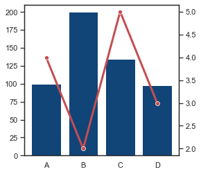 sns.set(style="white", rc={"lines.linewidth": 3}) fig, ax1 = plt.subplots(figsize=(4,4)) ax2 = ax1.twinx() sns.barplot(x=['A','B','C','D'], y=[100,200,135,98], color='#004488', ax=ax1) sns.lineplot(x=['A','B','C','D'], y=[4,2,5,3], color='r', marker="o", ax=ax2) plt.show() sns.set()