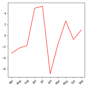 Dans les codes ci-dessus, nous avons créé un objet axes, créé un tracé de ligne par-dessus, ajouté un titre et fait pivoter toutes les étiquettes x-tick de 45 degrés dans le sens inverse des aiguilles d’une montre.