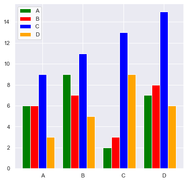 categorical_1 = ['A', 'B', 'C', 'D'] colors = ['green', 'red', 'blue', 'orange'] numerical = [[6, 9, 2, 7], [6, 7, 3, 8], [9, 11, 13, 15], [3, 5, 9, 6]] number_groups = len(categorical_1) bin_width = 1.0/(number_groups+1) fig, ax = plt.subplots(figsize=(6,6)) for i in range(number_groups): ax.bar(x=np.arange(len(categorical_1)) + i*bin_width, height=numerical[i], width=bin_width, color=colors[i], align='center') ax.set_xticks(np.arange(len(categorical_1)) + number_groups/(2*(number_groups+1))) # number_groups/(2*(number_groups+1)): décalage du xticklabel ax.set_xticklabels(categorical_1) ax.legend(categorical_1, facecolor='w') plt.show()