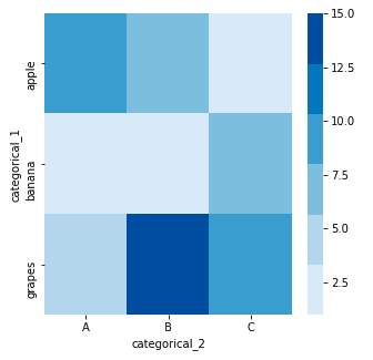 # heat map import numpy as np import pandas as pd import matplotlib.pyplot as plt import seaborn as sns df = pd.DataFrame(dict(categorical_1=['apple', 'banana', 'grapes', 'apple', 'banana', 'grapes', 'apple', 'banana', 'grapes'], categorical_2=['A','A','A','B','B','B','C','C','C'], value=[10,2,5,7,3,15,1,6,8])) pivot_table = df.pivot("categorical_1", "categorical_2", "value") # Essayez d'imprimer pivot_table pour voir à quoi cela ressemble ! fig, ax = plt.subplots(figsize=(5,5)) sns.heatmap(data=pivot_table, cmap=sns.color_palette("Blues"), ax=ax) plt.show()