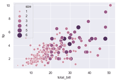 import seaborn as sns tips = sns.load_dataset("tips") ax = sns.scatterplot(x="total_bill", y="tip", hue="size", size="size", sizes=(20, 200), hue_norm=(0, 7), legend="full", data=tips) plt.show()