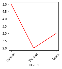 fig, ax = plt.subplots(figsize=(3,3)) ax.plot(['Camille','Thomas','Laura'], [5,2,3], color='r') ax.set_xlabel('TITRE 1') for tick in ax.get_xticklabels(): tick.set_rotation(45) plt.show()
