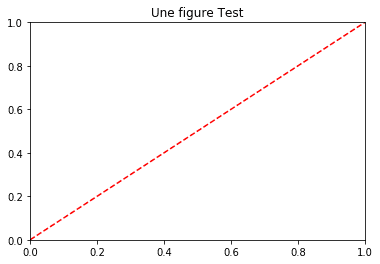 plt.figure() plt.plot([0, 1], [0, 1],'r--') plt.xlim([0.0, 1.0]) plt.ylim([0.0, 1.0]) plt.title('Une figure Test') plt.show()