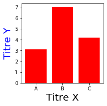 fig, ax = plt.subplots(figsize=(3,3)) ax.bar(x=['A','B','C'], height=[3.1,7,4.2], color='r') ax.set_xlabel(xlabel='X title', size=20) ax.set_ylabel(ylabel='Y title' , color='b', size=20) plt.show()