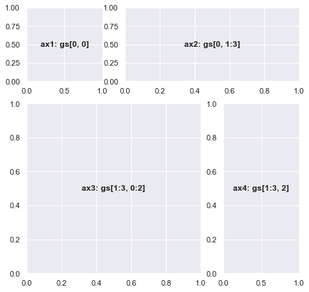import matplotlib.gridspec as gridspec fig = plt.figure(figsize=(7,7)) gs = gridspec.GridSpec(nrows=3, ncols=3, figure=fig, width_ratios= [1, 1, 1], height_ratios=[1, 1, 1], wspace=0.3, hspace=0.3) ax1 = fig.add_subplot(gs[0, 0]) ax1.text(0.5, 0.5, 'ax1: gs[0, 0]', fontsize=12, fontweight="bold", va="center", ha="center") # adding text to ax1 ax2 = fig.add_subplot(gs[0, 1:3]) ax2.text(0.5, 0.5, 'ax2: gs[0, 1:3]', fontsize=12, fontweight="bold", va="center", ha="center") ax3 = fig.add_subplot(gs[1:3, 0:2]) ax3.text(0.5, 0.5, 'ax3: gs[1:3, 0:2]', fontsize=12, fontweight="bold", va="center", ha="center") ax4 = fig.add_subplot(gs[1:3, 2]) ax4.text(0.5, 0.5, 'ax4: gs[1:3, 2]', fontsize=12, fontweight="bold", va="center", ha="center") plt.show()